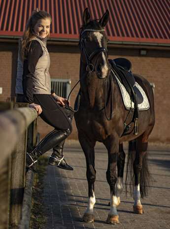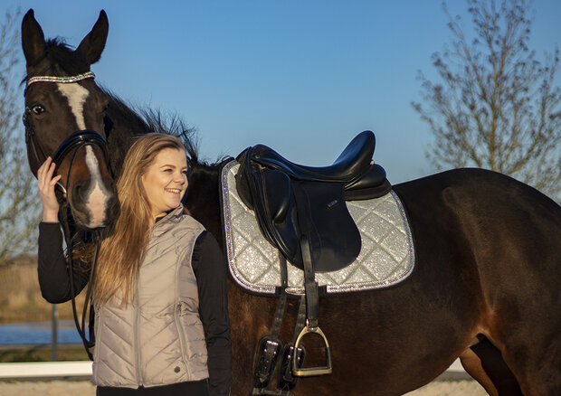 De frontriem is belegd met glanzende rhinestones bevestigd in zilveren cupjes. De rhinestones worden met de hand met extra sterke garen vast gemaakt aan het leer, zodat de we kwaliteit hoog kunnen houden. Rhinestones zijn gemaakt van uitstekend geslepen, gepolijst en gekleurd glas. Het verschil tussen rhinestones en swarovski is dat swarovski relatief veel meer lood bevat. Dat neemt niet weg dat de rhinestones ook enorm schitteren in zon! De rhinestones zijn in veel verschillende kleuren verkrijgbaar, waardoor we zoveel verschillende combinaties kunnen maken.