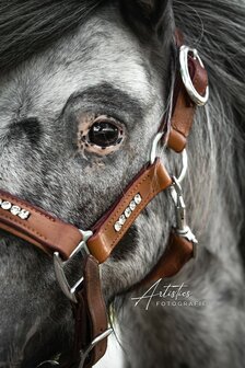 De neusriem en bakstukken zijn ingelegd met glanzende rhinestones bevestigd in zilveren cupjes. De rhinestones worden met de hand ingelegd in het halster, zodat de we kwaliteit hoog kunnen houden. Rhinestones zijn gemaakt van uitstekend geslepen, gepolijst en gekleurd glas. Het verschil tussen rhinestones en swarovski is dat swarovski relatief veel meer lood bevat. Dat neemt niet weg dat de rhinestones ook enorm schitteren in zon! De rhinestones zijn in veel verschillende kleuren verkrijgbaar, waardoor we zoveel verschillende combinaties kunnen maken.
