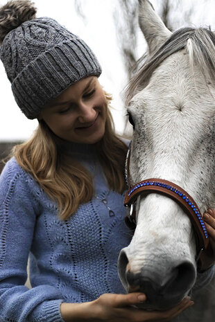 De neusriem en bakstukken zijn ingelegd met glanzende rhinestones bevestigd in zilveren cupjes. De rhinestones worden met de hand ingelegd in het halster, zodat de we kwaliteit hoog kunnen houden. Rhinestones zijn gemaakt van uitstekend geslepen, gepolijst en gekleurd glas. Het verschil tussen rhinestones en swarovski is dat swarovski relatief veel meer lood bevat. Dat neemt niet weg dat de rhinestones ook enorm schitteren in zon! De rhinestones zijn in veel verschillende kleuren verkrijgbaar, waardoor we zoveel verschillende combinaties kunnen maken.