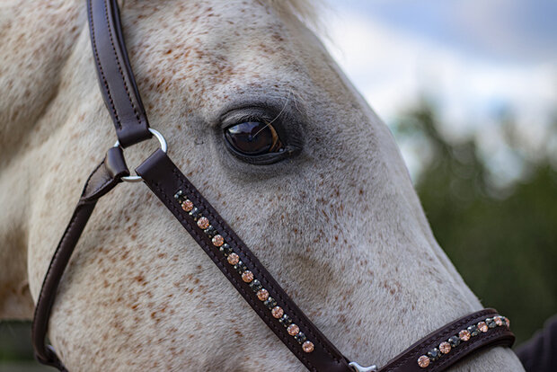 De neusriem en bakstukken zijn ingelegd met glanzende rhinestones bevestigd in zilveren cupjes. De rhinestones worden met de hand ingelegd in het halster, zodat de we kwaliteit hoog kunnen houden. Rhinestones zijn gemaakt van uitstekend geslepen, gepolijst en gekleurd glas. Het verschil tussen rhinestones en swarovski is dat swarovski relatief veel meer lood bevat. Dat neemt niet weg dat de rhinestones ook enorm schitteren in zon! De rhinestones zijn in veel verschillende kleuren verkrijgbaar, waardoor we zoveel verschillende combinaties kunnen maken.