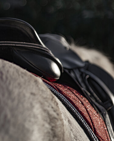 Je kunt het zadelsieraad eenvoudig op de lepel van het zadel aanbrengen middels de twee elastieken. Deze gaan onder de zweetbladen door en worden met drukknopen vastgemaakt aan de ringen voorop het zadel.